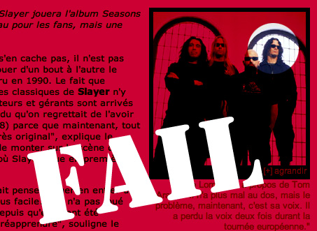 Oh boy. Quelle erreur. Dans le cadre de leur performance au Heavy MTL, le journal VOIR a fait une entrevue avec Dave Lombardo du groupe Slayer. L’entrevue est bonne. Le problème c’est que dans la mise en page c’est une photo du groupe à l’époque où Paul Bostaph était le batteur! Ça fait juste 9 ans qu’il est parti. En fin de semaine il jouait avec Testament.