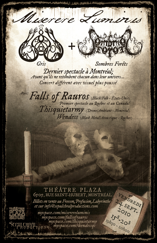 C’était un autre vendredi soir très chargé pour la ville de Montréal. Alors que du punk/grindcore sorti des enfers faisaient rage aux Katacombes avec Venomous Concept, Boulevard Brutal a plutôt décidé de couvrir un grand moment de l’histoire du black métal québécois. C’était le dernier concert pour Miserere Luminis avant le retour des membres dans leurs formations respectives (Sombres Forêts et Gris). Tout ça, au Théâtre Plaza de la merveilleuse rue Saint-Hubert.