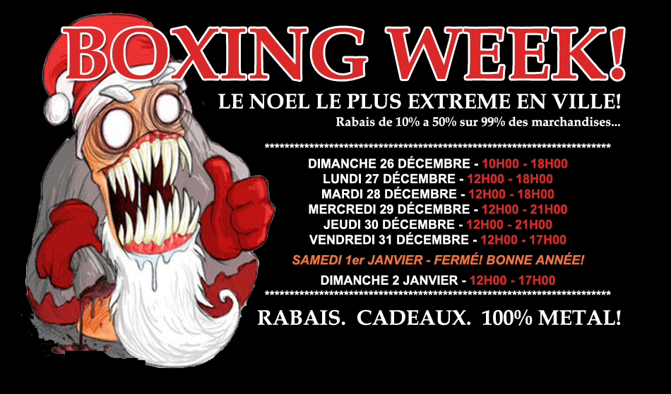 Le magasin PROFUSION va tenir son Boxing Week à partir du 26 décembre, et ce, jusqu’au 31. C’est aussi ouvert le 2 janvier. C’est une occasion en or pour mettre la main sur quelques disques brutaux en plus de profiter d’excellents rabais.