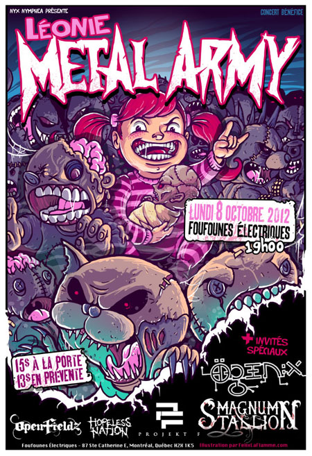 Si tu veux aider une petite fille malade en voyant un show métal, voilà ta chance. Le Léonie Metal Army ça se passe le 8 octobre aux Foufs. Le poster est sharp hein? C’est une job de Félix Laflamme. Ça me touche cette histoire-là. Bravo à Nyx pour l’initiative.
